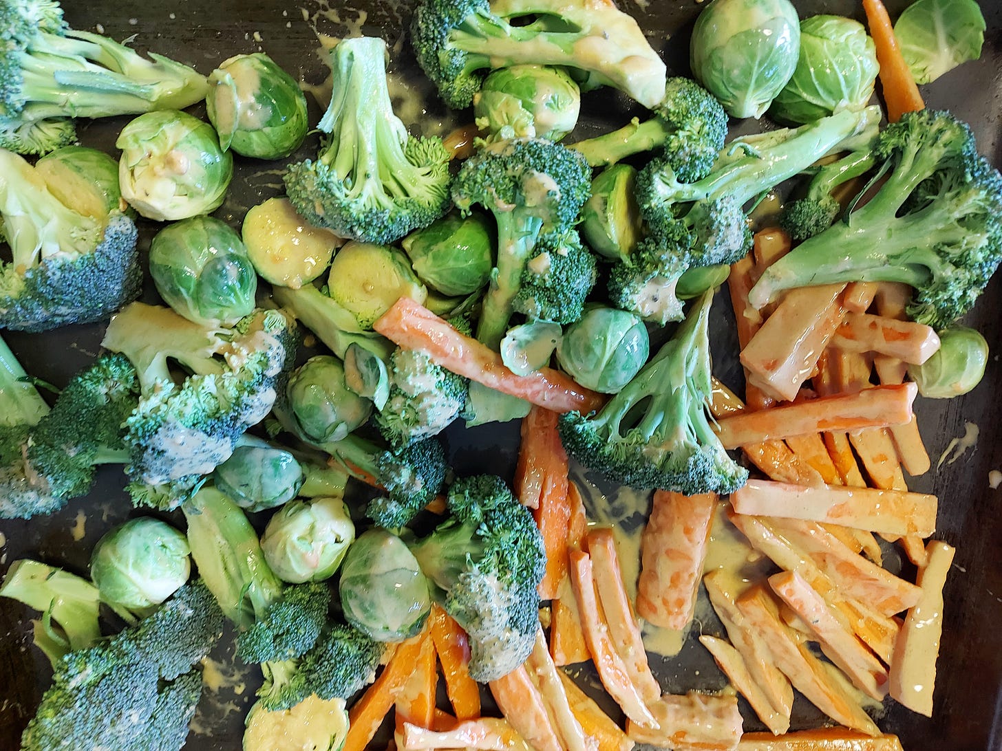 - Add 3-4 tablespoons of both mustard and balsamic vinegar to every 1kg (2.2lb) of veg.